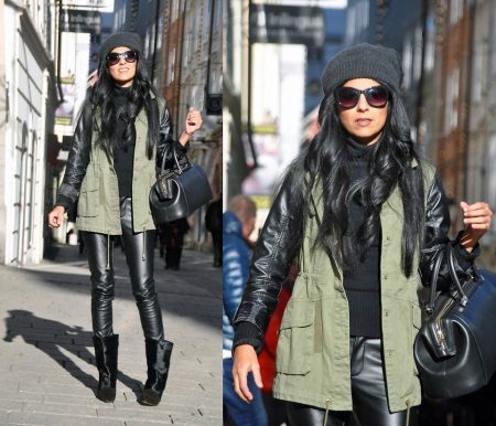 Another good option is leather leggings that blend perfectly with the matte “protective” fabric of the voluminous parka.