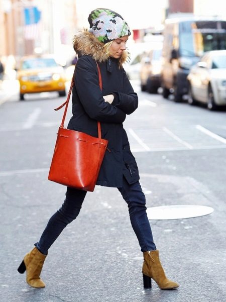 An ideal winter look for every day, which is based on a blue parka. Suede ginger ankle boots look great with blue jeans. Bright orange bag fits perfectly into the overall style of the image, thanks to the color of the boots and red fur on the hood, but it does not look boring. The hat, made in white and green colors, refreshes the image.