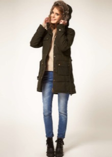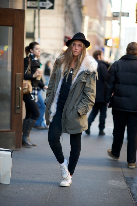 - Military. We add military-style trousers to the park, tight-fitting and emphasizing the silhouette, you can also resort to leather trousers. In no case do not wear wide variations of trousers with the park - the image threatens to look baggy.