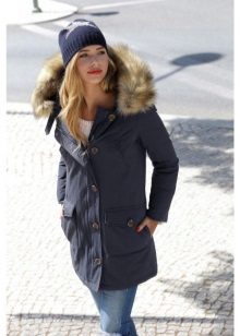 In many modern versions of winter parkas, a number of details can be unfastened if desired, this is a hood, fur lining, and sometimes even sleeves. The detachable lining of the winter female park-pihor is usually made of sheepskin, rabbit or chinchilla. The hood trimmed with lush natural fur will come in handy in winter, it not only adorns, but also serves as additional protection against the cold. For a blue winter parka, red fox fur is best suited as a bright accent.