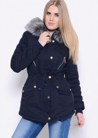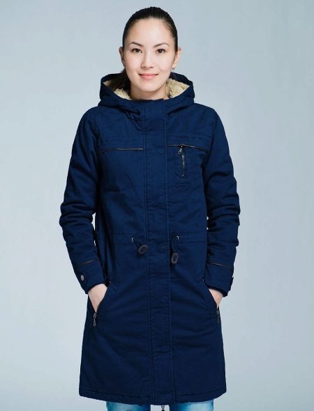 A classic version of the blue women's winter parka is a model below the thigh on a diagonal quilted lining containing modern synthetic filler, or on a lining of light faux fur. Elongated winter parks are a good competitor to down jackets. The winter parka has an overstated stand-up collar that covers the lower part of the face from frost, as well as a deep hood, a couple of patch pockets, an inside pocket and often an additional pocket on the sleeve, fastened with a hidden zipper.