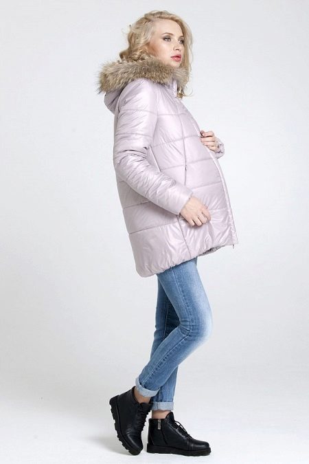 The original A-shaped silhouette of this jacket-parka favorably distinguishes its owner from the total mass of expectant mothers insulated for winter. A non-trivial color scheme, expressed in the “dusty rose” shade, a clasp camouflaged with a vertical strap, and a hood trimmed with raccoon fur, turning into a collar, will appeal to the most demanding fashionistas, who are waiting for the main miracle in the life of every woman.