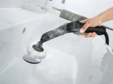 - An acrylic bathtub can be washed with a steam generator, used for joints between the bathtub and the wall, used for tiles. Using a device for the bathroom, it is advisable to add a disinfectant to the water tank, which allows you to disinfect surfaces and prevent mold growth. A steam appliance is used when cleaning the shower cabin from soap and lime deposits.