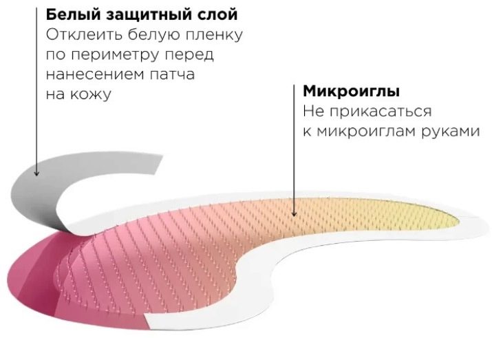 In direct contact with the upper layers of the skin the needles fall off and are absorbed deep into the tissues, where they are completely dissolved. Additional healing agents in the manufacture of such patches are salicylic acid, caffeine, peptides, niacinamide and other ingredients. Acting in a complex, these components accelerate cell regeneration processes, activate the synthesis of elastin and collagen. The result of applying patches becomes smooth light skin in the eye area.
