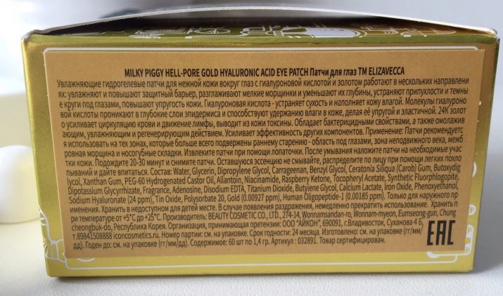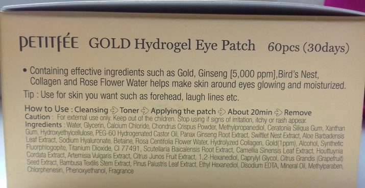 Korean manufacturers include exotic components such as pearl or ruby powder, snail mucin, swallow nest extract, colloidal gold, etc. So, gold contains the following patches based on hydrogel: