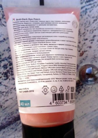 The aroma of gel inserts is pleasant. The amount of fluid is precisely calculated: it does not drain, but nourishes the skin profusely. Patches are glued onto the skin easily. Keep in place, do not slip from the area under the eyes. However, after the first application, the promised result is usually not visible. Manufacturers claim an instant result, but a noticeable effect appears only after 6 applications.