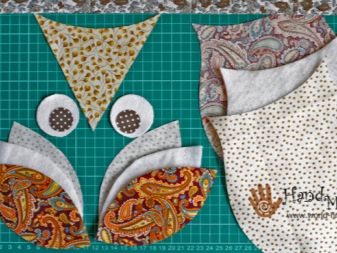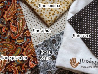 - For wings, you will need 4 parts (2 of a motley fabric with a front picture, 2 of fabric for the tummy). For the eyes, you need 2 parts made of white material, 2 - of dark polka-dot fabric. For the body, 2 parts, for the beak - 1. For the oblique inlay, 4 strips 4 cm wide are needed. For the body, the length of the oblique inlet is 60 cm, for the wings - 20 cm, for the top of the head with ears - 30 cm. 2 parts need to be cut out of the filler for wings and 1 for a body.