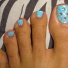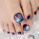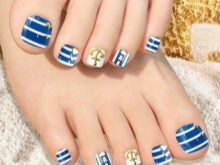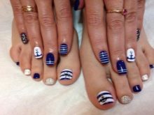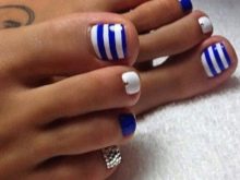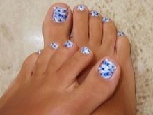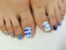 - Blue. Seeing its shades, thoughts of sea surface, clear water, pool come to mind. That is why blue pedicures are mainly done for the beach season. You can opt for a monophonic coating, but to get a special effect, pedicures should be supplemented with marine-themed drawings.