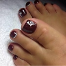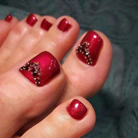 - The unique pedicure with a burgundy hue makes you attract attention to others. A rich decoration in the form of rhinestones complements the design of nails. This option pedicure is freely combined with any style of clothing.