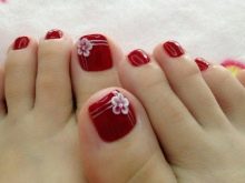- Red and burgundy. These colors this season are paying special attention to designers and stylists. Although many ladies preferred just such shades for their pedicure for several years in a row. Red color quite clearly and clearly expresses the boundaries of the nail, emphasizing its contour and beauty. The burgundy color has become a real hit this season, especially as a plain coating.