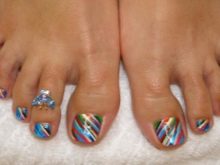 - Multi-colored. This season won the hearts of the fair sex with the opportunity to make pedicures varied, unusual and quite bright. For one design, more than twenty shades of varnish palette can be used. Various techniques can complement the design of the nails with sequins, rhinestones and stickers. It is important to note that the multi-colored palette is suitable for all types of nails, for short and slightly extended ones.