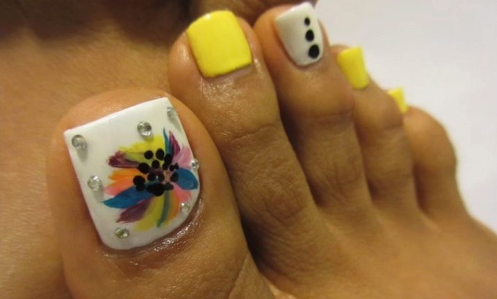 - Yellow. Basically, its shades are used in the summer, but this season yellowness colorful looks as the basis for a pedicure. Bright colors are mainly suitable for young girls. It should be noted that the monophonic coating of nails in yellow this season looks extremely ridiculous. Such a pedicure must be varied with rhinestones, drawings and stickers. The main thing is to choose the right theme.