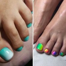 - Bright pedicure. This option has incorporated all the colors of the rainbow and not only. The brightness of the pedicure can be represented in light green and lemon color. Or in a combination of saturated blue and poisonous pink flowers. The main thing is the presence of a transition border.