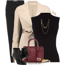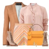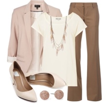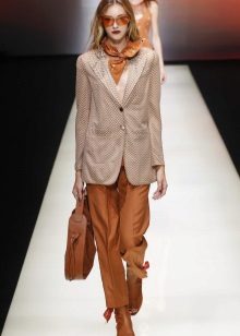 An interesting business look, which consists of a creamy blazer, vest and classic amber trousers. A pair of brown leather heeled sandals and a small handbag on a milk-colored chain complete the look.