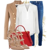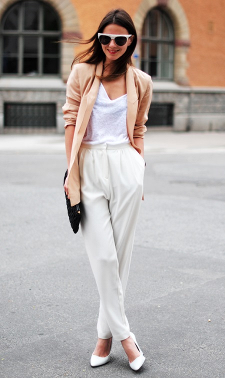 An ideal summer look that fits into the business and casual dress code, it is also suitable for an evening out. Thanks to a loose beige blazer and light white trousers, we get a great look in casual style. What could be better for a hot summer? White wedge pumps complete the look. The highlight of this outfit is attached to white-framed sunglasses and a black clutch.