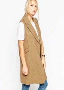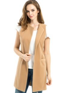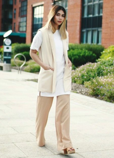A chic look consisting of a beige sleeveless jacket, an elongated white top, and beige wide leg pants. Round off the image of a platform sandal on a camel shade, which give it an elegant, finished look.