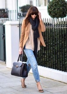 The beige jacket will go well with an elegant dress. It is desirable that the jacket was free-cut, this will allow you to create a striking game in contrasts, and you will certainly draw attention to your person.