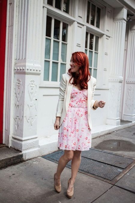 If you want to stand out in a crowd, this image is perfect for every day. But it is also ideal for a romantic date. Creamy blazer and airy white dress with red lips print. Beige heeled shoes complement the look. Believe me, the looks of all passers-by will be riveted to you!