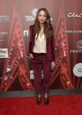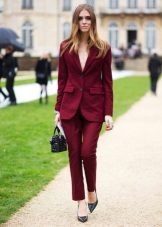 - The combination of burgundy top with a snow-white bottom looks no less festive. For example, you can put on a tight-fitting white top under a jacket, complementing it with white trousers and white high-heeled shoes.