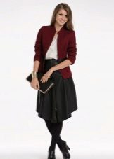 - A burgundy jacket with a gray bottom, for example, with a tight gray skirt or gray strict trousers, looks good. For this set, pick up burgundy shoes, for example, low boots or wedge shoes.