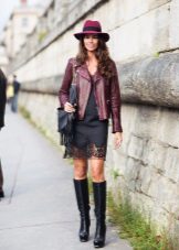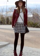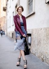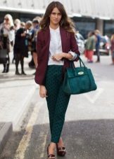 - A good combination is the burgundy color of the jacket and the animal print of a top or blouse (for example, a leopard print). Choose a plain skirt or trousers for such a set, for example, saturated green.