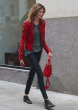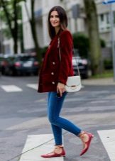 - If you want to create a sports bow, wear a burgundy jacket with jeans (for example, blue or blue), complementing the outfit with burgundy sneakers.