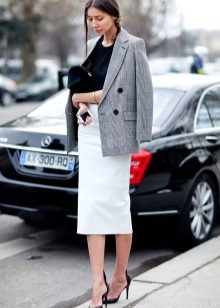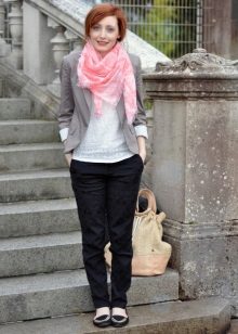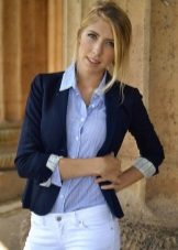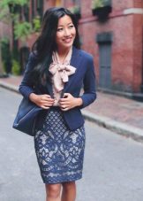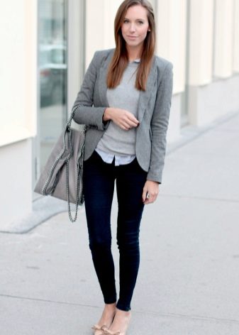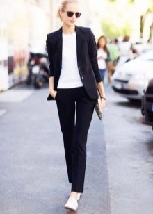 Business suit. A classic jacket perfectly complements a set of a strict or romantic blouse and a pencil skirt or straight trousers. The color scheme is desirable classic, elegant shoes with heels or traditional boats are suitable as shoes.