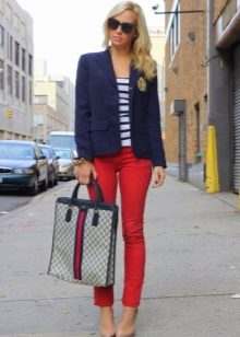 Very stylish and sexy look: a dark blue double-breasted jacket with rolled up sleeves, worn on a naked body. Classic trousers of the same shade are put on in a set for a jacket, gilded buttons and a small handbag are used as accessories. No vibrant colors or catchy accessories. The image should be bold, but not defiant!