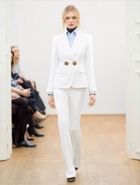 An effective option for a business woman: a snow-white trouser suit + a light blue shirt. As accessories, large, catchy buttons on a jacket and a neckerchief are used. Strictly and very feminine!