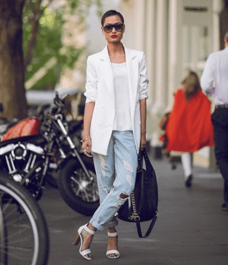 A perfect example of casual style: ripped blue jeans + heeled sandals + tank top + snow-white jacket with a free cut. Simple and stylish!