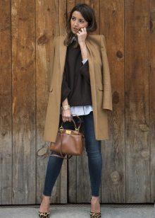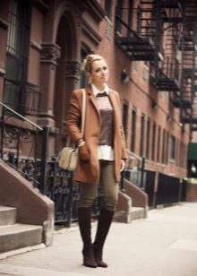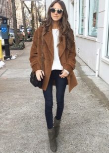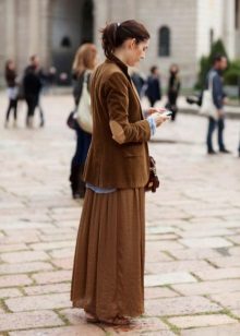 Brown long jacket better to wear with dark trousers or skirts. But the models of a shortened cut can be combined with wardrobe elements of other tones. But surely shoes should be matched to the tone of the jacket.