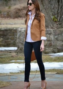 A brown jacket is perfect for embodying a stylish bow for a business meeting or for everyday life. To create an image of a business woman, a jacket can be worn with a sheath dress or a pencil skirt. Elegantly looks a tandem of blue trousers and a thin pullover of a simple cut or smooth top. Many girls prefer to wear jeans that are also in perfect harmony with a jacket of any brown shade.