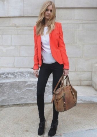 Skirt. Short jackets look very stylish with lush, flared skirts up to the knee. It turns out a very feminine set in a romantic style. A denim blazer will complement a leather mini skirt. The jacket can be any color, not necessarily classic blue.