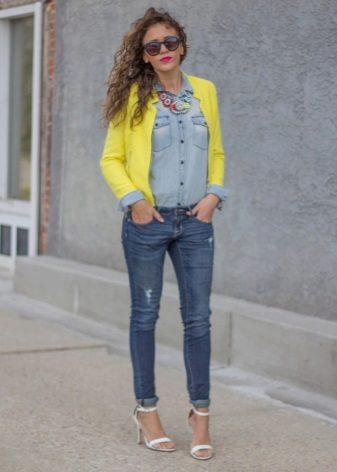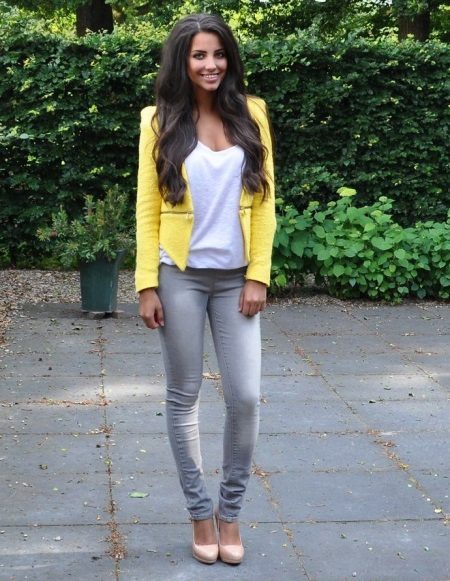 Romantic summer look: tight gray jeans or leggings + a white top or T-shirt + a light jacket in rich yellow. Very simple and stylish outfit, which will complement the shoes in pastel colors.