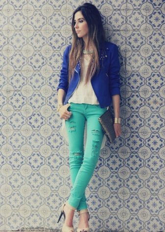 Jeans. Classic combination: jeans + denim jacket. Well, if they are designed in a single color scheme. Jeans can be of any cut - from skinny to flared. Under a denim jacket, you can wear a top or shirt. A striking addition to the youth image will be a beautiful belt, catchy accessory or handbag.