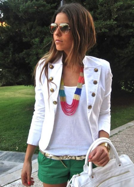 Spectacular outfit for a cool summer morning: white 3/4 sleeve jacket + white tank top + emerald mini shorts. As accessories, multi-colored beads and a thin gilded belt are used.
