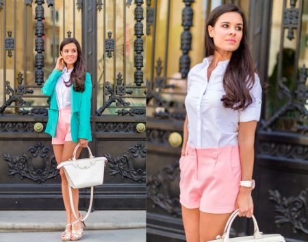 Try pairing a pastel-colored fitted jacket with classic high waist shorts for a work-approved look. Ideally, a white T-shirt and heeled sandals will suit this look, which will give an image of sophistication and lightness.