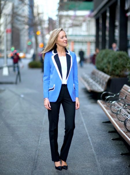 Contrast combinations, for example, a blue jacket and black dress pants, look elegant and stylish.