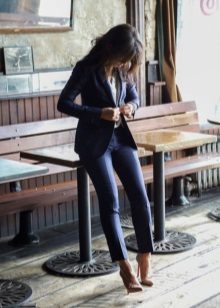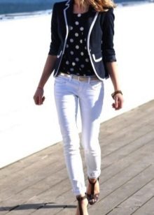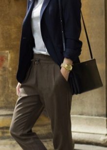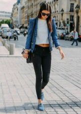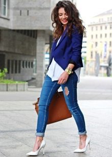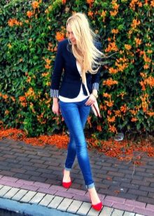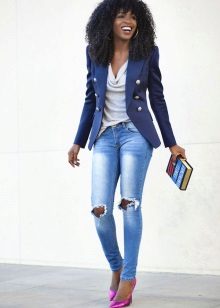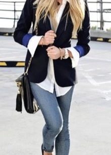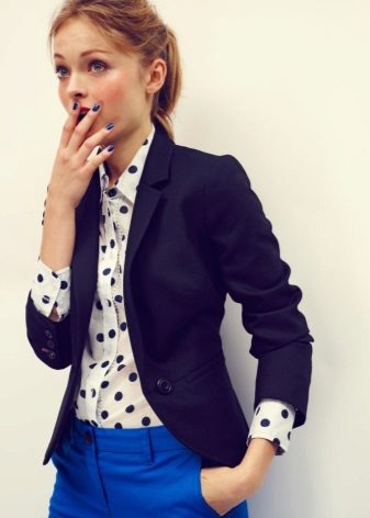 To create an office style - just combine a blue jacket with trousers of a classic cut. To create a free street style, young girls like to combine blue jackets with jeans of the same shade. Light beige or white trousers will make a perfect ensemble of a navy or bright blue jacket.