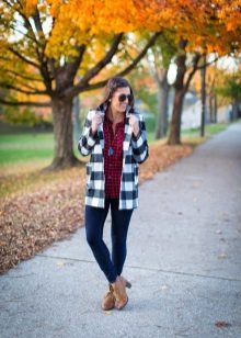 A large cell will visually enlarge the figure. If your choice nevertheless fell on a jacket in a cage - then let only he dominate in the image. Other items of clothing should be chosen monochrome and preferably in tone with one of the colors of the jacket's cage.