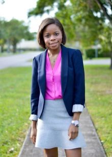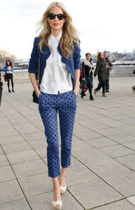 - A bright blue blazer with a romantic light blouse is a great option for dating or meeting friends.