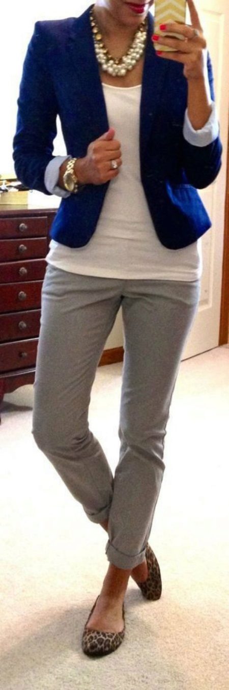 The combination of a navy jacket and gray trousers is perfect for meeting friends, going to the movies, or going to the exhibition. But office weekdays will be perfectly diluted with a similar set. Gray trousers and a jacket in cornflower blue or turquoise shades with: