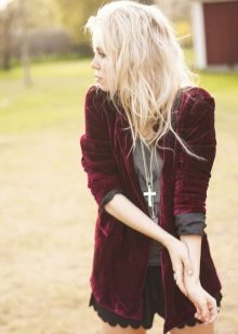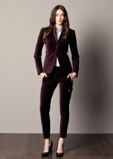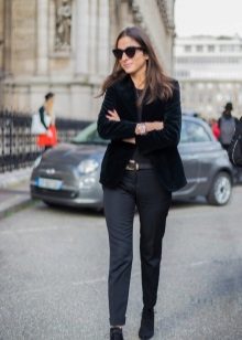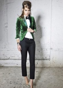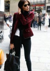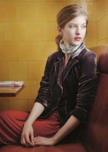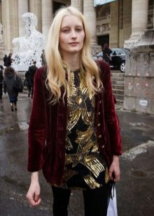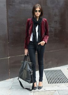 In a strict and restrained manner you can safely use a velvet jacket of noble burgundy, gray or dark green colors. If his style does not have any additional details, then light blouses, voluminous tops, strict trousers and straight-cut skirts will look great with him. As accessories in this way, you can use a small watch, a small handbag or a not too voluminous bracelet in a contrasting color.