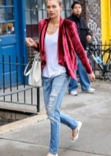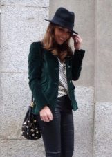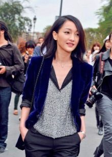Fitted velvet jacket very well fit into the image in retro style and casual style. You can combine it with any bottom - be it a skirt, trousers or even jeans. But there is one nuance: it is recommended to wear a velvet jacket only to slender girls, since the texture of the fabric itself adds a volume that is completely useless to the ladies in the body.