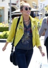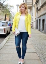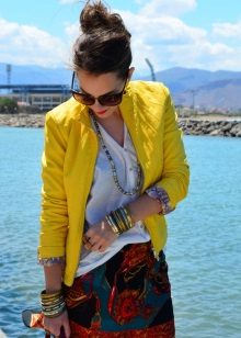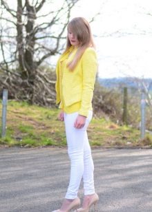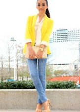 When choosing a yellow jacket, in no case should you forget that you wear very bright clothes. Therefore, you should be especially careful in compiling bows with a jacket of this shade.