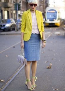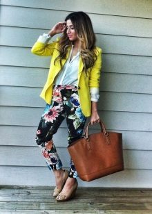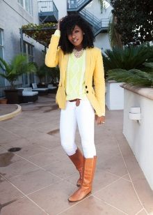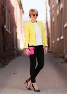 A great example of a business ensemble with a yellow jacket. White trousers and a gray jumper look very restrained and neutral, and a jacket in combination with a voluminous silver jewelry slightly dilute the austere look.