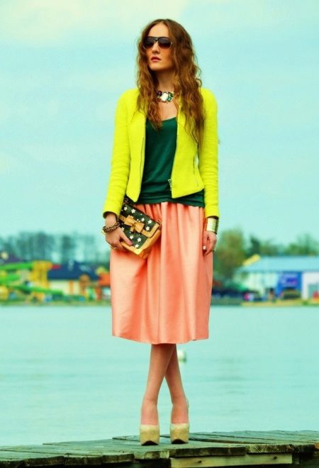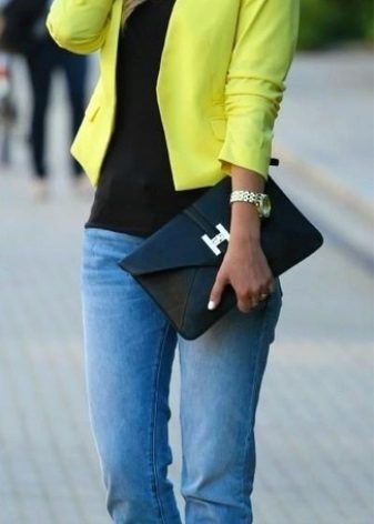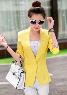 Bright jacket yellow neon shade most often sewn from thin fabrics that hold their shape perfectly. Such models suggest wearing only in the summer, because in the cold and transitional season, such a tone would be completely inappropriate. A bright yellow jacket will emphasize your tan very favorably and help create a unique and memorable image.
