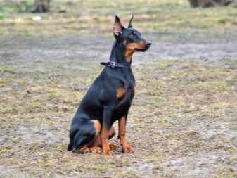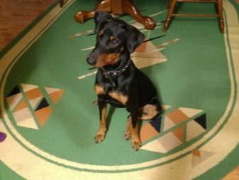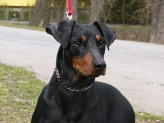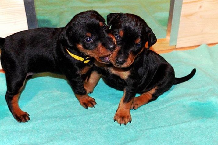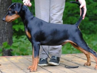 The eyes of the dogs are oval, with dark, tight-fitting eyelids, the ears are triangular on the cartilage, the ends hang down, are located high. With standard ear lengths, they should not be higher than the top of the skull. The tail and ears can be stopped at an early age, but this is not a mandatory requirement for the breed. The position of the dog’s neck is curved; it is of medium size, with a smooth transition to the withers. The body of the pinchers looks square, with a slight slope to the tail, the chest is wide, oval in shape.