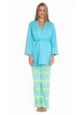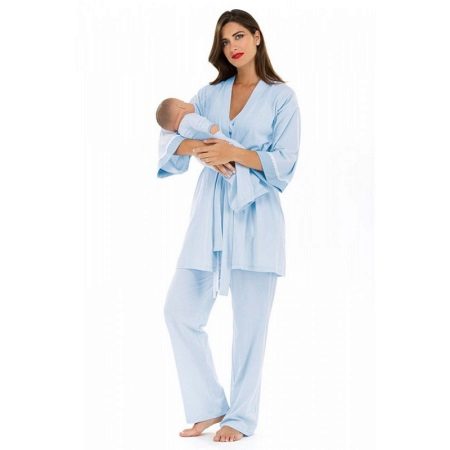 A wide, delicate, airy set consisting of a shirt, pants and a short bathrobe, as well as a baby bodysuit made in the color of pajamas. Great for the hospital. In such pajamas it is not a shame to receive guests, relatives. In addition, it is easy to hide the imperfections of the figure.