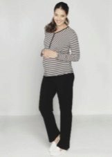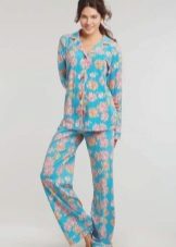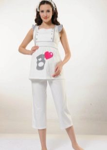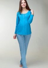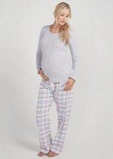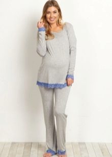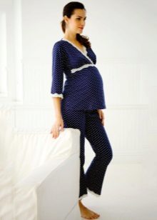 Even while pregnant, you can find the girlish version of pajamas. A shirt with buttons with a wide bottom allows you to not tighten your stomach even in recent months, and lace sleeves add romance and airiness. Wide cotton trousers will warm in spring and autumn.